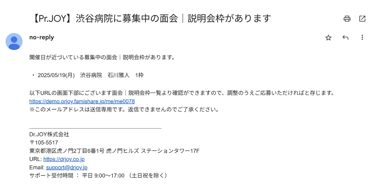 Pr.JOY上の「病院からのお知らせ」で、説明会や面会枠の追加情報を確認できます。
